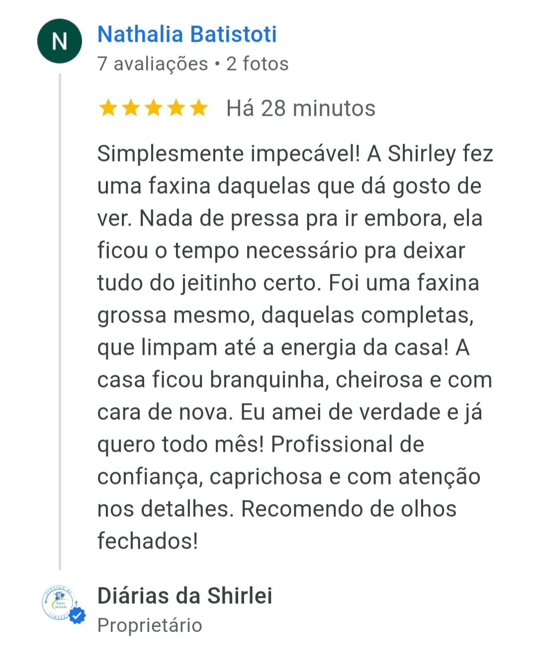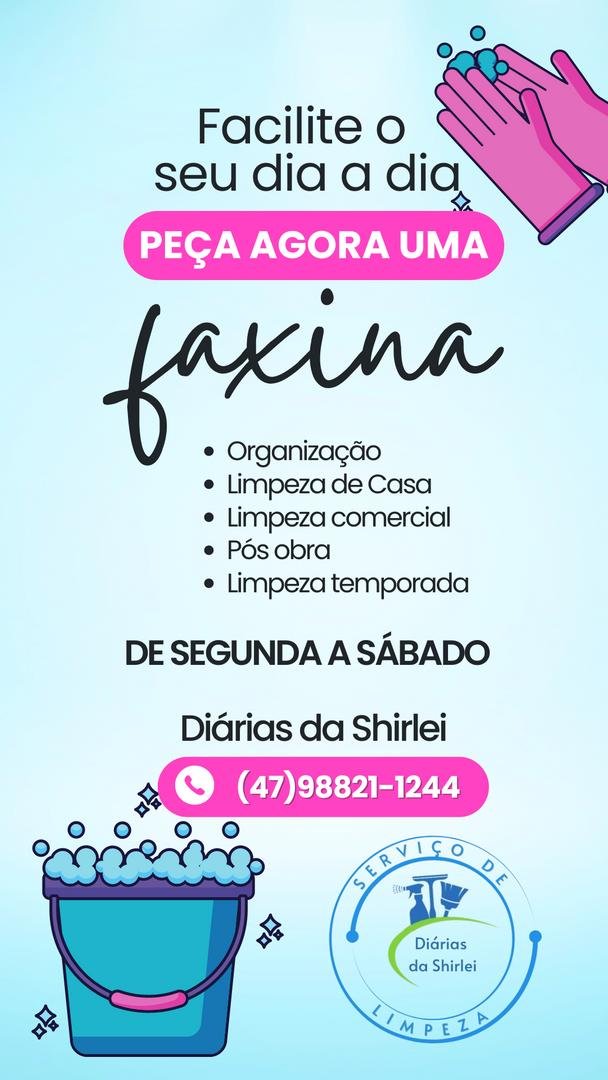 Olá, tudo bem! Me chamo Shirlei, sou ativa, gosto de organização, limpeza com água, eu lavo do chão ao teto viu! Minha diária é pesada. Faço diárias, mensal, quinzenal em casas, apartamentos e comercial. Também trabalho com pós obra e com limpeza temporada. Minha faxina você ficará encantada! Haa tambem faço limpeza de sofá com máquina profissional. Me chame e veja a disponibilidade do dia. Abraços!